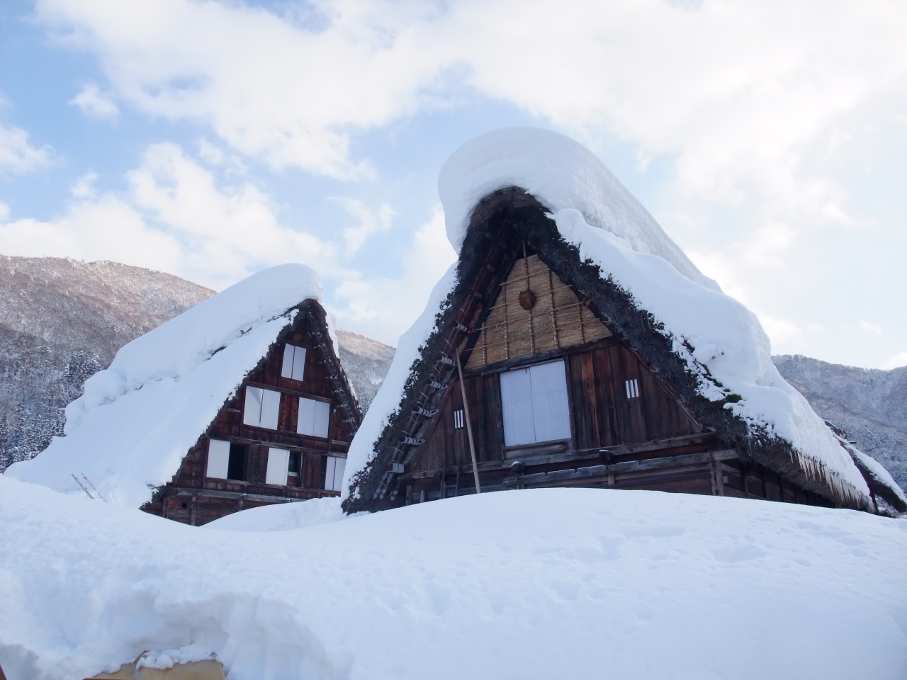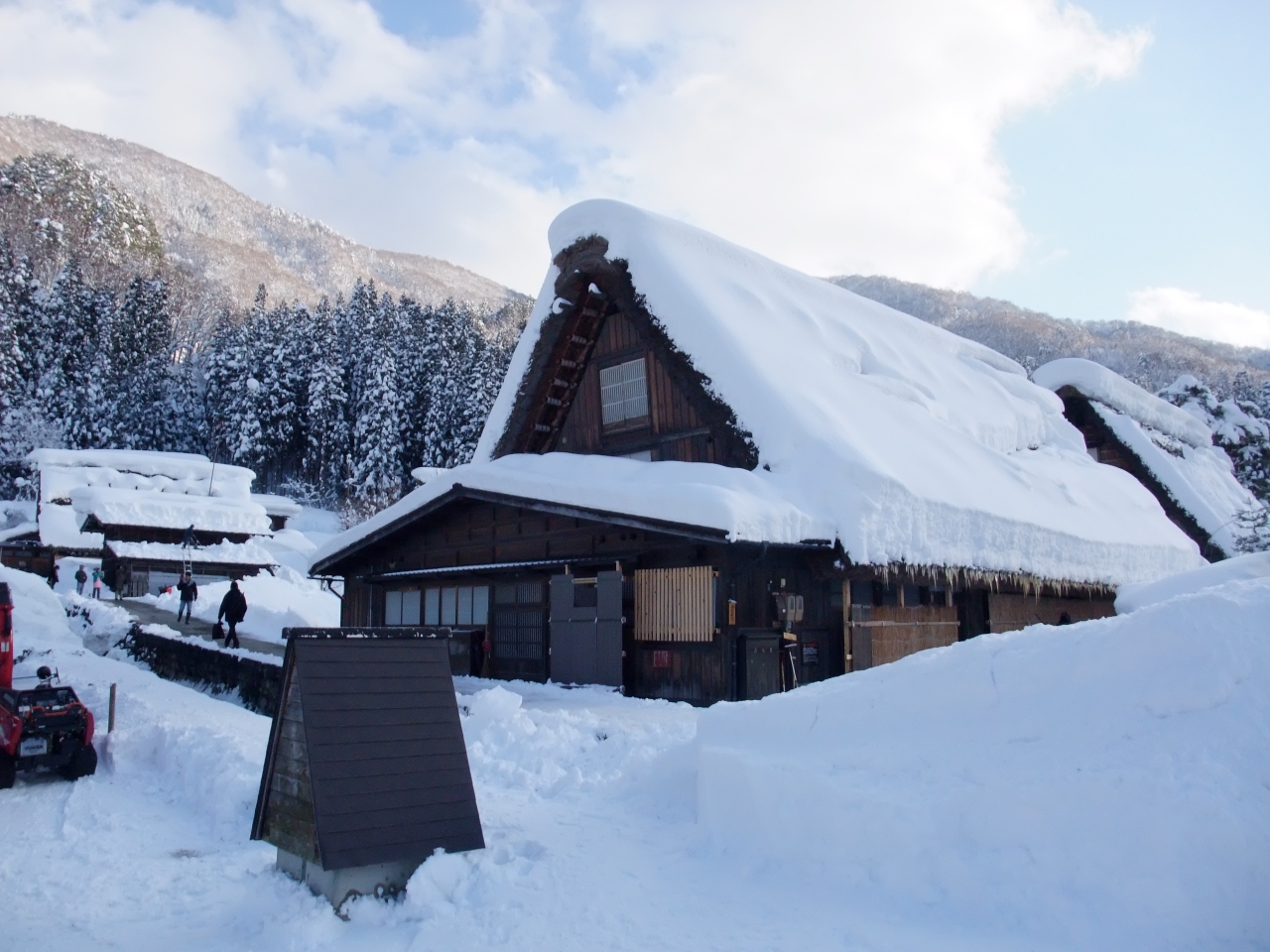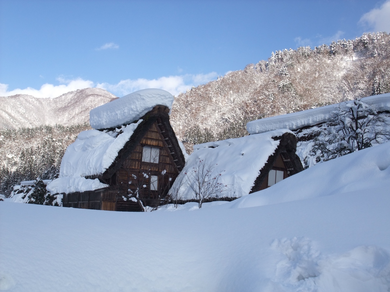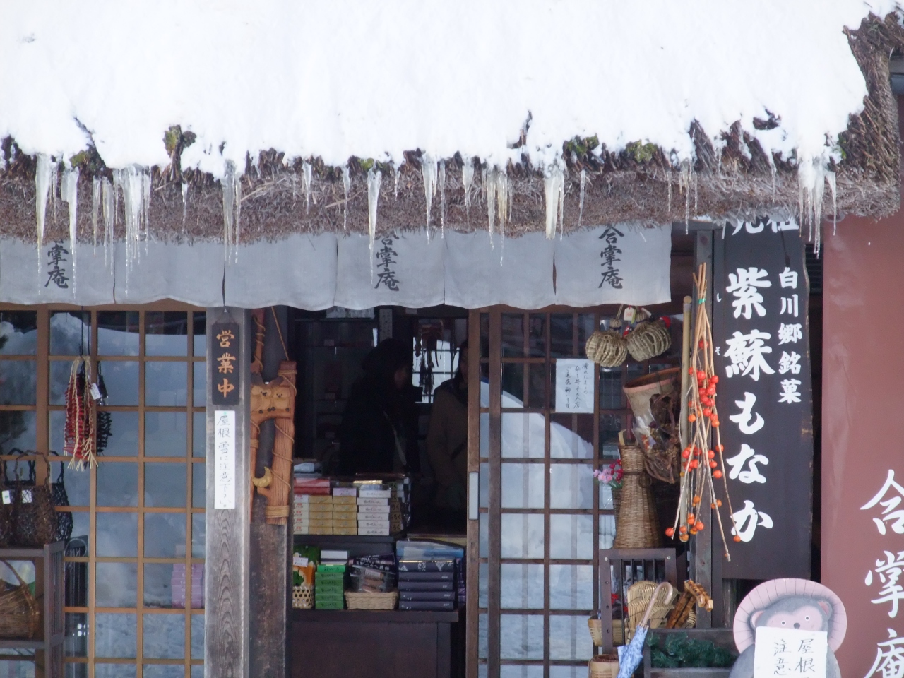 この年は大雪だったようで、合掌造りの屋根に積もった雪がすごい量です。合掌造りの古い民家と雪の風景は、「日本昔話」の世界そのもののように思えました。