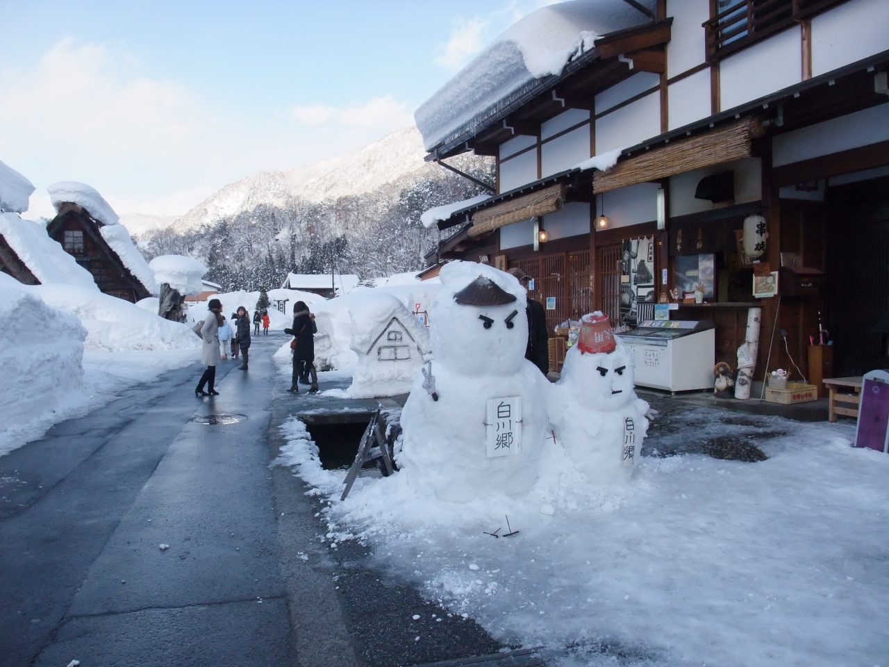 荻町に入ってすぐの所にあるお土産店の店先では、木彫りのゆきんこが出迎えてくれました。荻町には合掌造りに泊まれる民宿が何軒かあります。