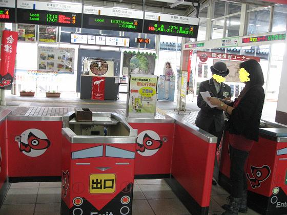 インパクト大の駅舎で大きな赤べこがお出向えしてくれます。
