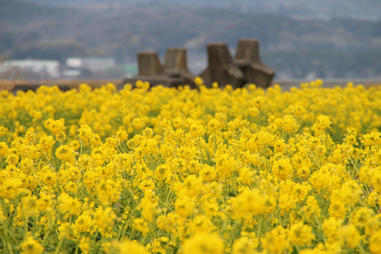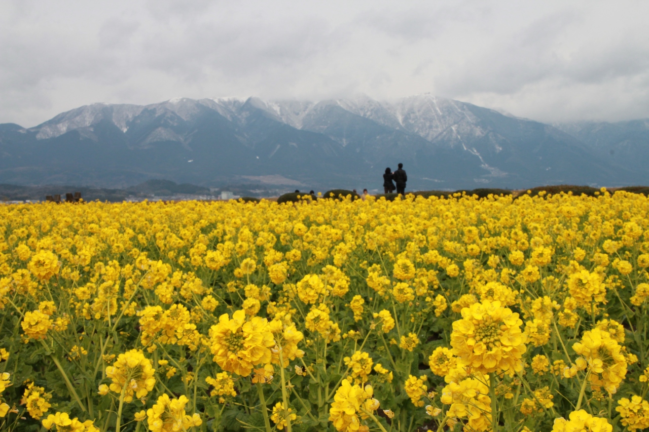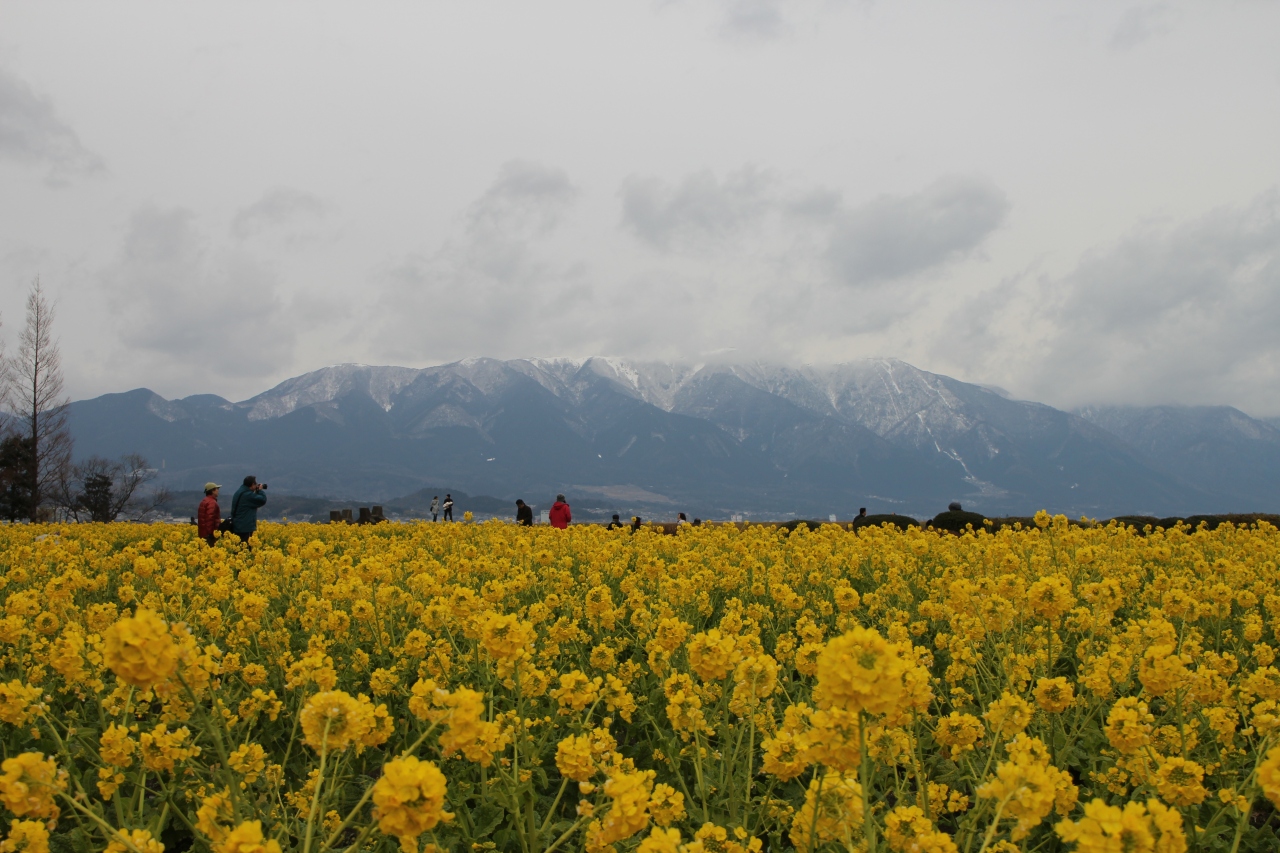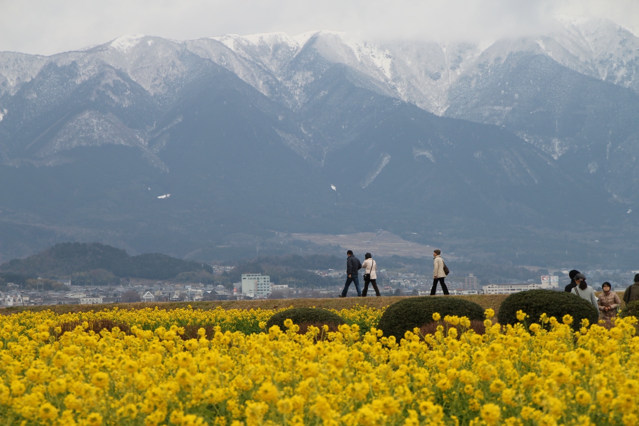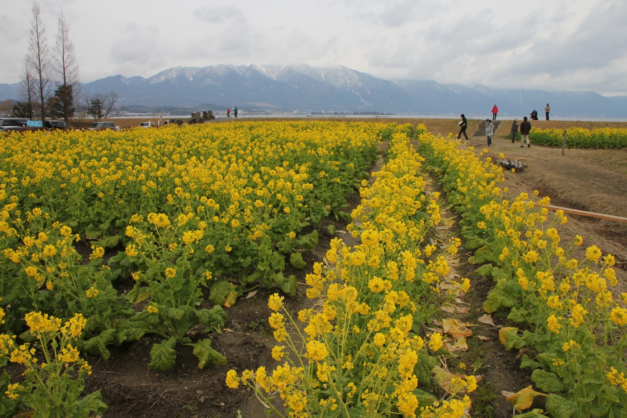 寒咲き花菜12,000本(4,000?)/1月下旬〜2月下旬/定休日/時間自由/無料/駐車場無料282台/JR「守山駅」よりバス「第一なぎさ公園」下車スグ/名神栗東ICから30分または湖西道路真野ICから15分とのこと。