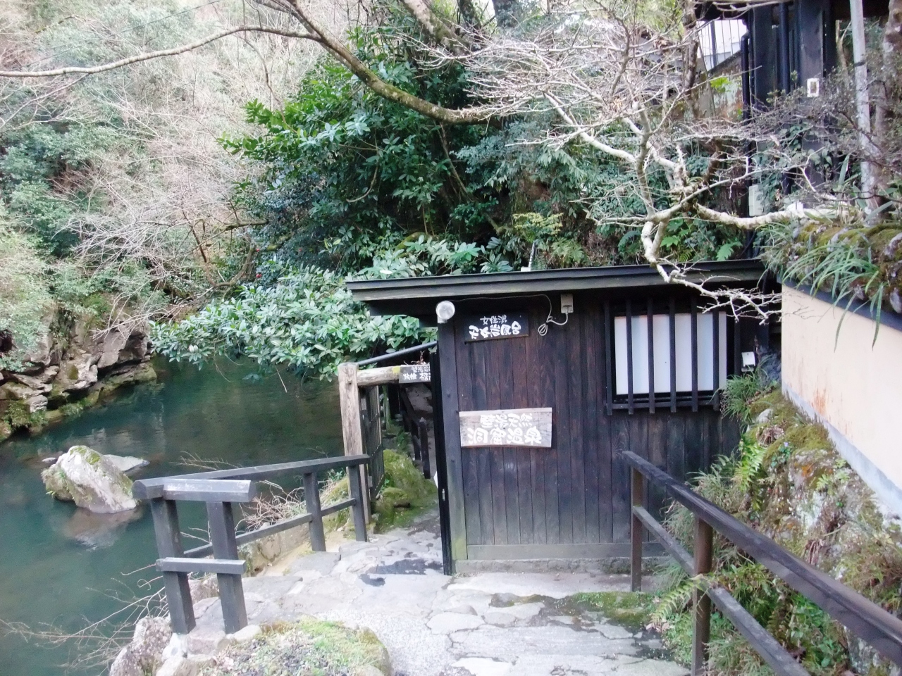 私達はここで、日帰り入浴をさせていただきました。入浴料は1人300円でした。 日本秘湯を守る会の宿・壁湯温泉「福元屋」の天然岩風呂は、川沿いの岩壁をくり抜いた洞窟温泉で、温泉に入りながらにして、素晴らしい渓谷美を眺められます。ここは屋根だけある露天風呂で、混浴になっています。女性の泊り客には、宿よりバスタオルを貸していただけます。