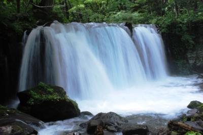 道路沿いに「銚子大滝」の看板を見つけ、渓流沿いをしばし歩いたところで、やっと滝がみつかりました!ツアーだとピンポイントで連れて行ってもらえますが、個人だと少々迷うかも...。とはいえ、人の多いほうへ向えばすぐ見つかります。幅20メートル、高さ7メートルの見事な水量を誇る「銚子大滝」は、ちょうど前日大雨が降ったことも重なりかなりの水量でした!滝の横にいると、ミストがばっさばっさかかり、マイナスイオンたっぷり!地面は常に濡れているので、足元に注意が必要です。