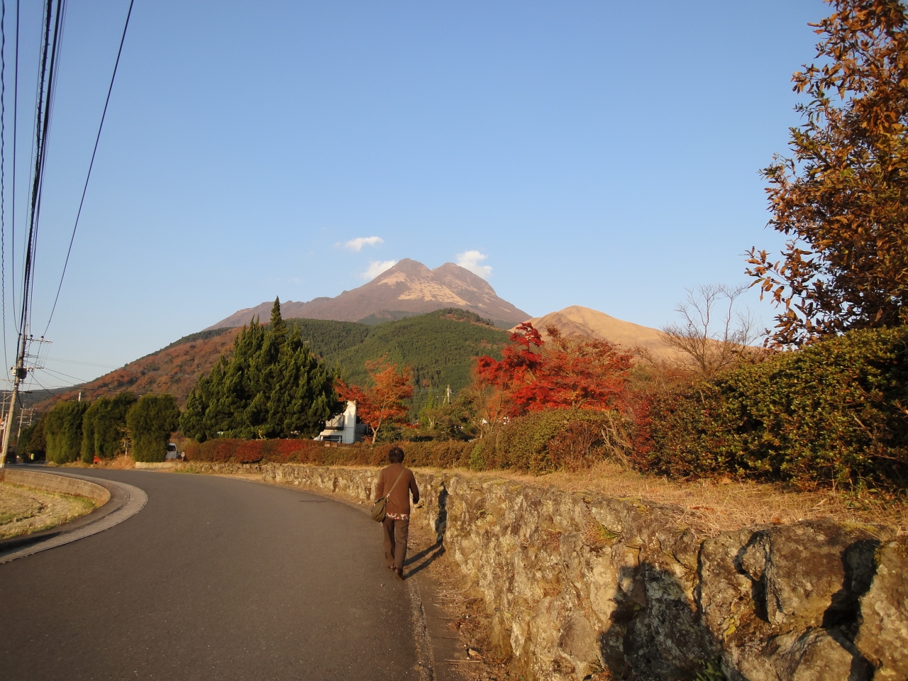 紅葉の赤や濃い緑、由布岳の茶と合わさって