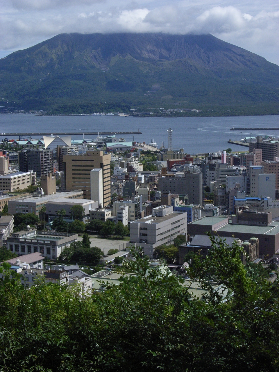 眼下には鹿児島の町が広がり、対岸には噴煙をあげる桜島と、そこへ渡るフェリーなどが見えます。