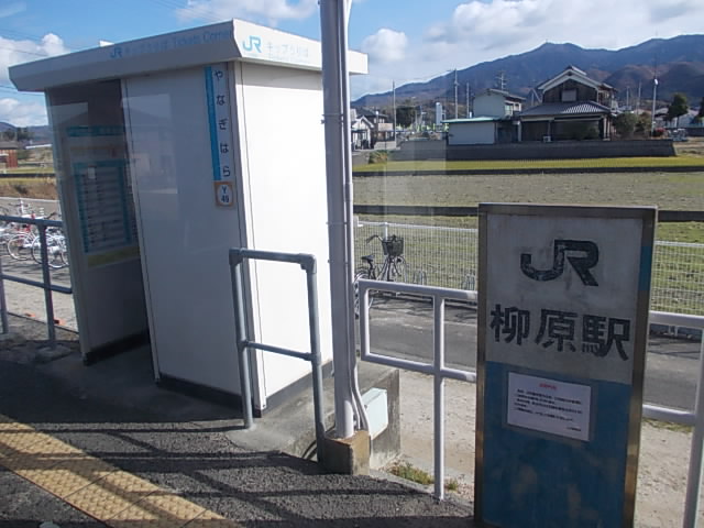 四国を鈍行列車で旅していると、突然大きな駅舎が現れたり、かと思えば駅舎がないっ、なんて驚かされることもあったりと、かなりバリエーションに富んでいて楽しめたりするものですが、この柳原駅は後者の範疇に入ります。典型的なローカル駅で、駅舎(?)らしき小さな物置のような場所には、近距離切符の自販機が備えられているだけ、という、何とも微笑ましい駅でした。