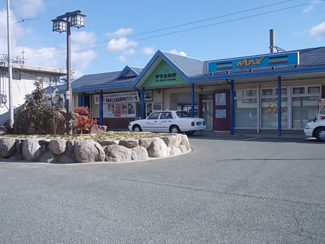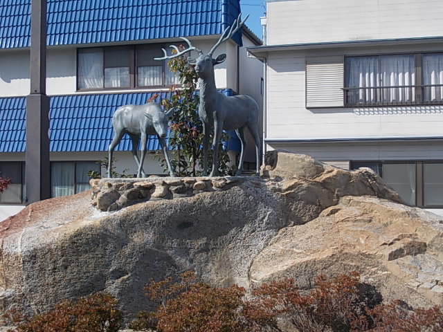 北条は、今では松山市域に編入されていますが、元々は別の町でしたので、駅舎は結構立派でした。しかも駅前には、二匹の夫婦(?)鹿の像が…。何故かなあと思いつつ、駅の人に尋ねてみると、ここの近くにある鹿島は、文字通り野生シカが有名な所だそうで、それに因んで、この像も造られたそうです。駅のスタンプにも鹿が描かれていますので、マニアの方はお見逃しなく…。