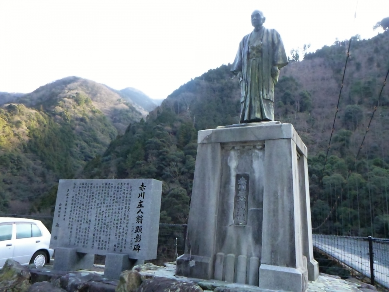 怖いため途中で引き返しましたが、出た後で気がつくと、入口のところにつり橋を立てた人の顕彰碑と注意書きがありました。それによると、この赤川橋は森林管理を目的とした市道のため、観光中の事故は一切管理者は責任を負いませんということです。