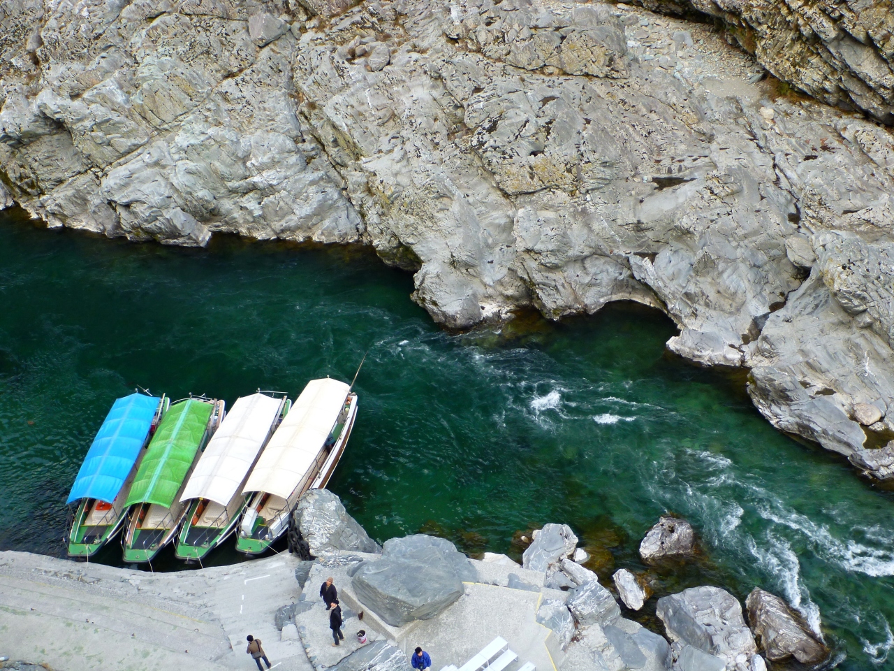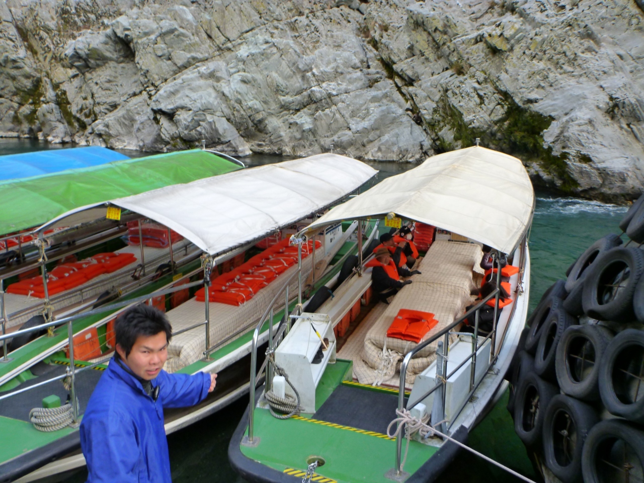 しかし、さすがに渓谷だけあって寒い!の一言で、遊覧船にはそれなりに観光客は乗っていましたが、船の中では電気カーペットの上にテーブルと炬燵布団を置き、一人一個ずつ懐炉を渡して暖をとっていました。