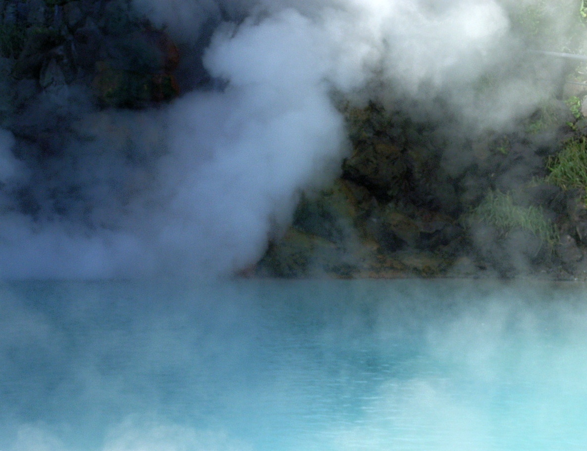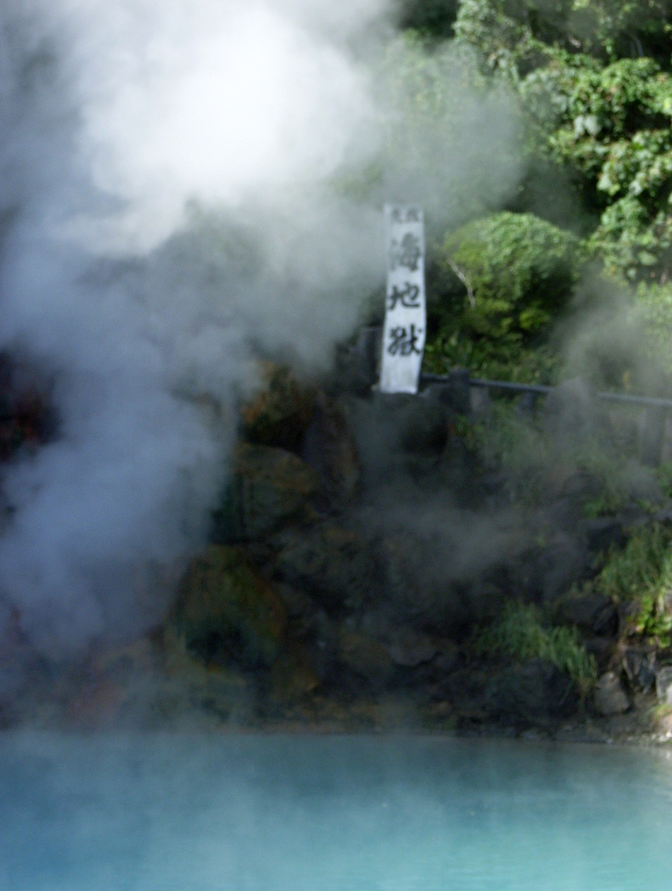 別府地獄めぐりの一つ、海地獄は、その名のとおり青い色をした温泉です。この青色は硫酸鉄を含んでいるためということですが、青い水から盛んに蒸気があがっているため、印象的です。また、温泉の上には卵を入れた籠がつるされており、温泉卵も名物になっています。
