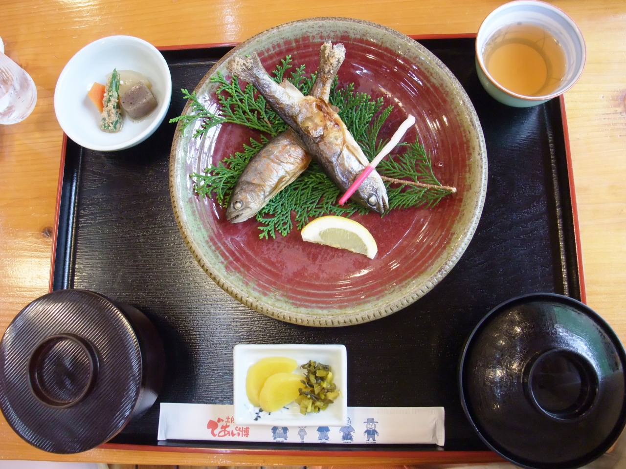 私達は、木が巧みに使われた「木の香」のレストランで、遅い昼食を取りました。私は、「本川産あめご塩焼きセット」1490円、夫は、「お魚の身切れのっけ豆腐」1080円を食べました。川の傍の木の香では、せせらぎを聞きながら、地元の味を味わえます。