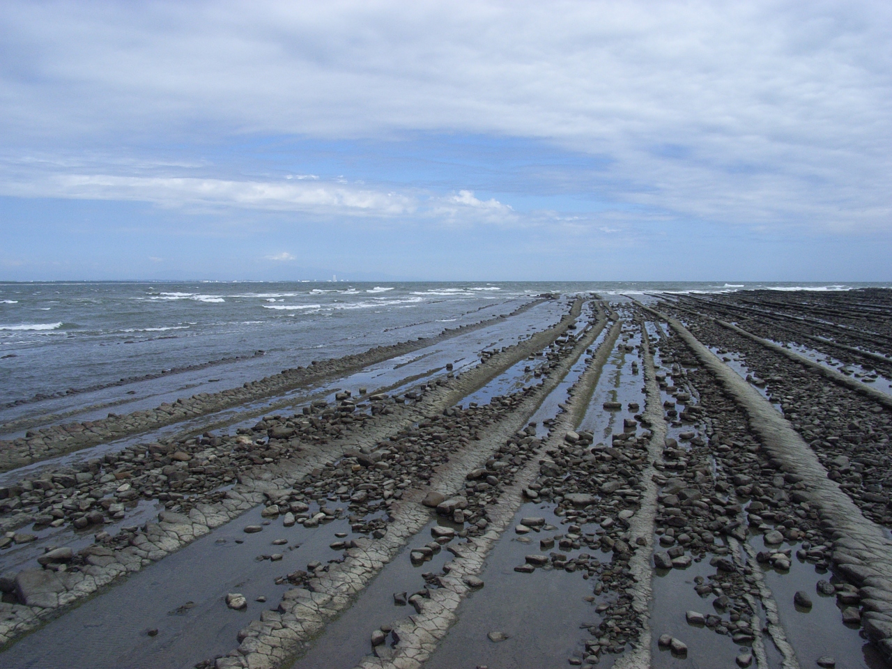 鬼の洗濯板とは、横倒しになった地層が波により削れて、硬い部分だけがギザギザのような形で残り、それが巨大な洗濯板のようだということで、「鬼の洗濯板」と名づけられました。