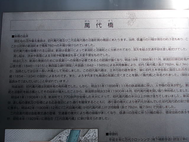 新潟市の歴史を振り返る上で、忘れてはならないのがこの橋でしょう。2004年に重要文化財に指定される際、従来の万代橋から旧字体に逆改称した、というのも面白いと思います。名前だけでなく景観その他においても、当時の風情に近づける努力がなされたようですが、それが行き過ぎて、現代式の道路標識の表示を撤去してしまったために、橋の名前が解らない、などという苦情が逆に寄せられた、というのも皮肉なものですね。尚、観光向けには本物の橋の手前に、小さなレプリカのようなのがあって、説明板も設置されていますので、こちらをご参照下さい。