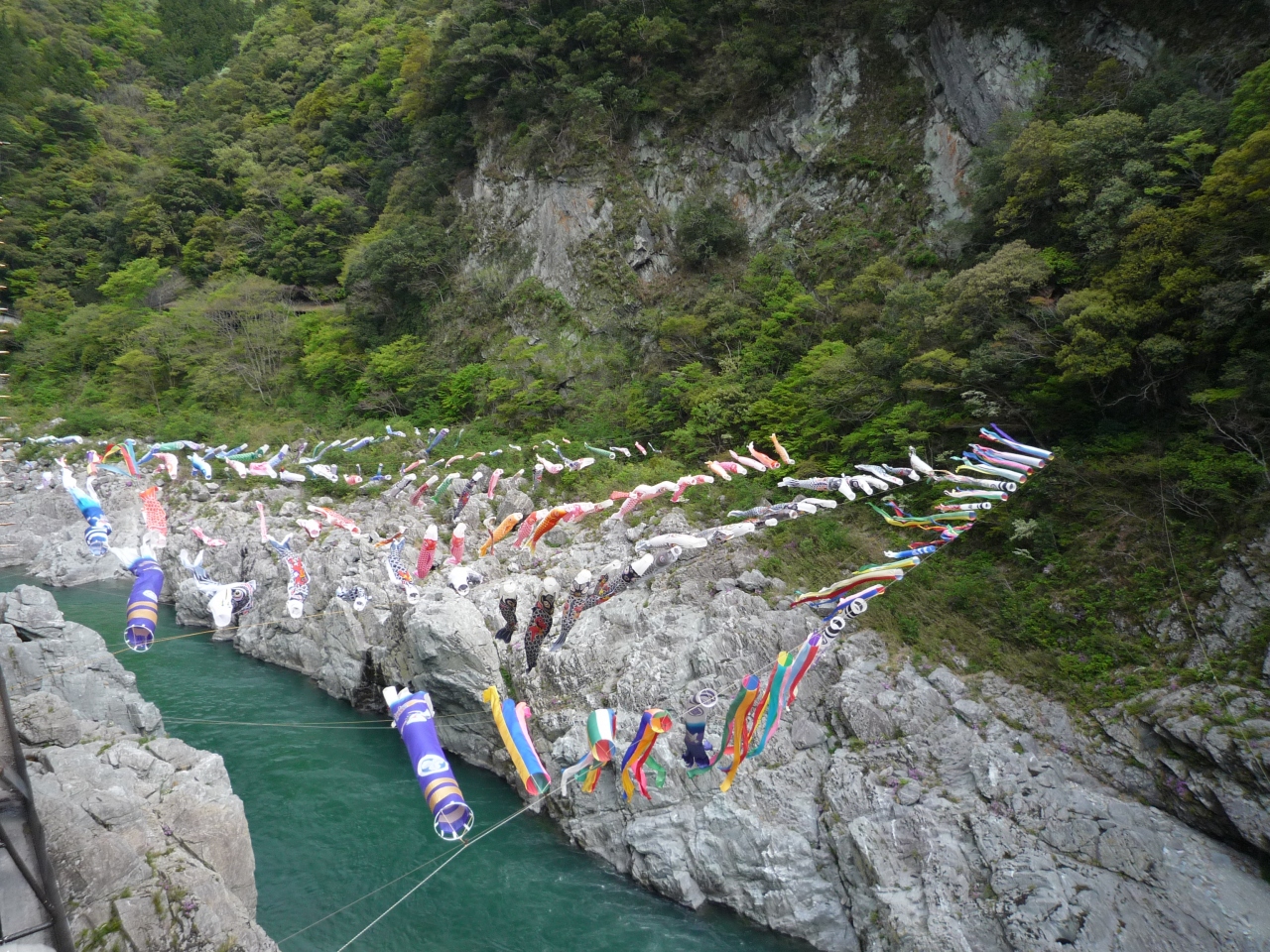 そそり立つ断崖の間を渓流が水しぶきをあげて流れる様は迫力満点。吉野川沿いに走る国道32号線からの車窓からでも充分ですが、ぜひ足を止めて谷底へ行ってもらいたいです。エメラルド色に輝く水の流れと2億年余りの歳月をかけて形成されたといわれる美しい岩肌は、近くに行くとより美しさを増します。あと、こいのぼりも気持ちよさそうに泳いでいました。