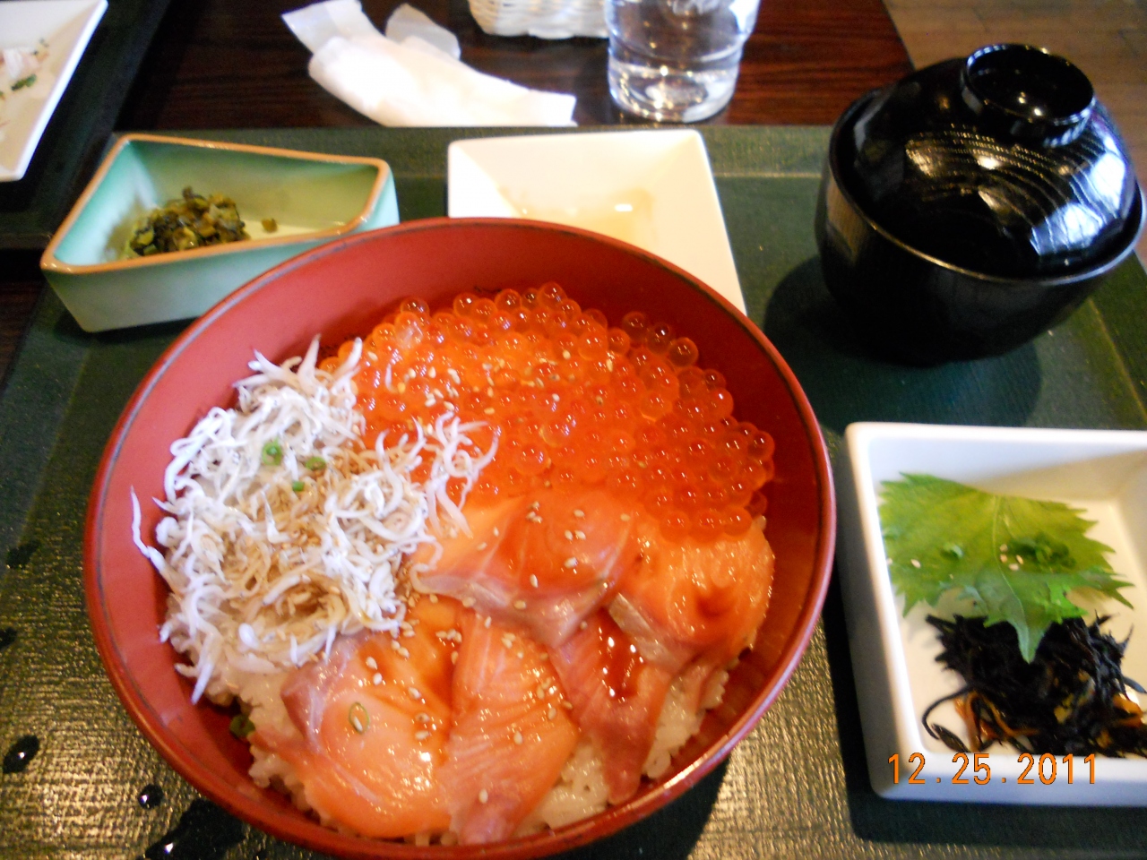 ランチセットは、1000-2300円くらいでいくつか種類があり、選べました。 横浜発祥の、牛鍋"コラーゲンすき焼き"もランチメニューにあります。 私は、サーモンといくら、しらすの三色丼を注文しました。