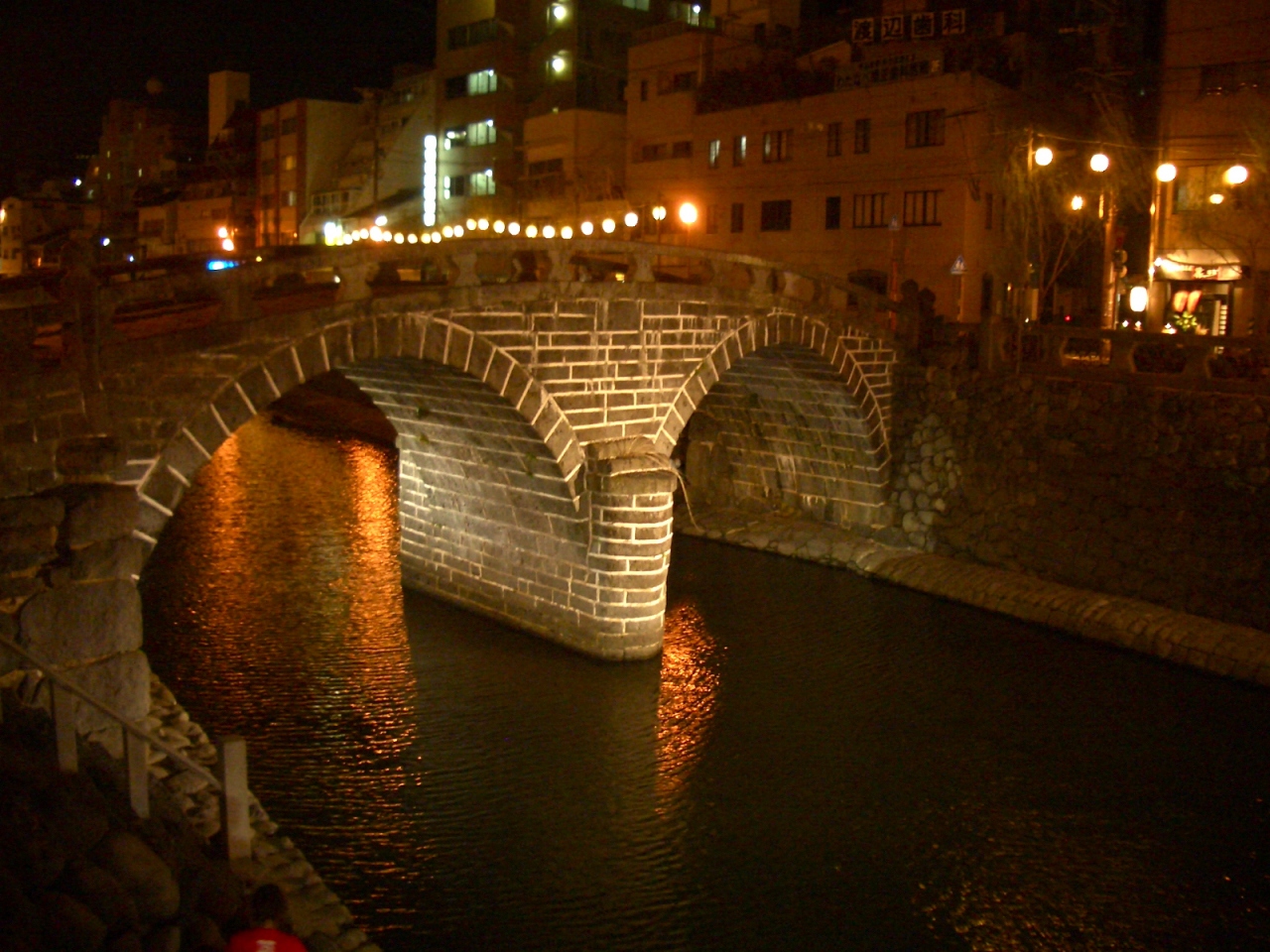 夜に行くと、ガイドブックに載っている、水面に橋が映って眼鏡のようには見えないのが残念! でも、観光地としてはとても有名な場所の1つなので長崎を訪れたら行っても良いと思います。 眼鏡橋以外にも色々な形の橋がかかっています。