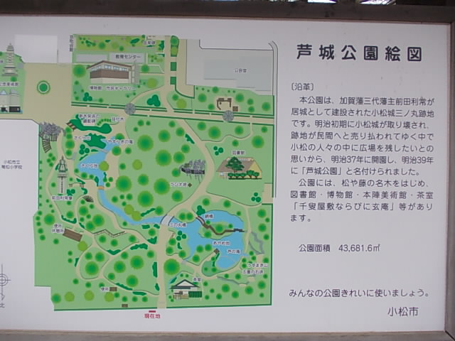 JR小松駅から程ない距離に広がる、小松市民の憩いの場として愛されている公園です。ここの魅力はまず何といっても美しい庭園があることでしょう。茶室に関しては入園時期・時間が限られていますが、庭園はいつでも見ることが出来ますので、お散歩に最適な場所だと思います。その他、公会堂や図書館、美術館などもありますので、小松を代表する文化的エリアだと捉えるのが良いでしょう。
