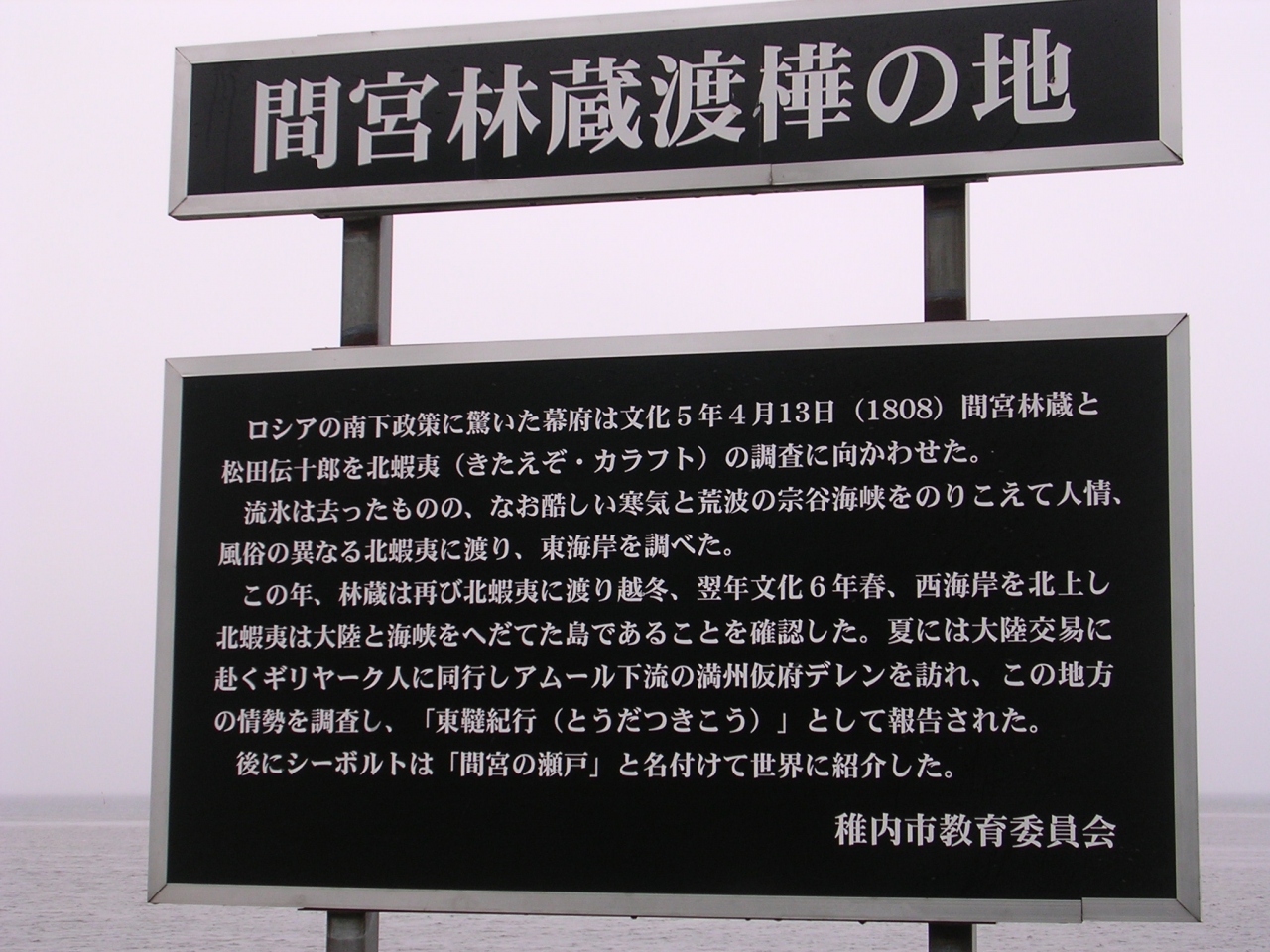 宗谷岬から車で10分~15分程度西側に行ったところの海岸線にありますが、あまりに地味なのでよく注意していないと通り過ぎてしまうかもしれません。江戸時代の探検家である間宮林蔵は、この日本最北端の場所から2回にわたり樺太を探検し、樺太が大陸とつながっていないことを明らかにしました。もう少し観光地化してもよいかな、と思いますね。