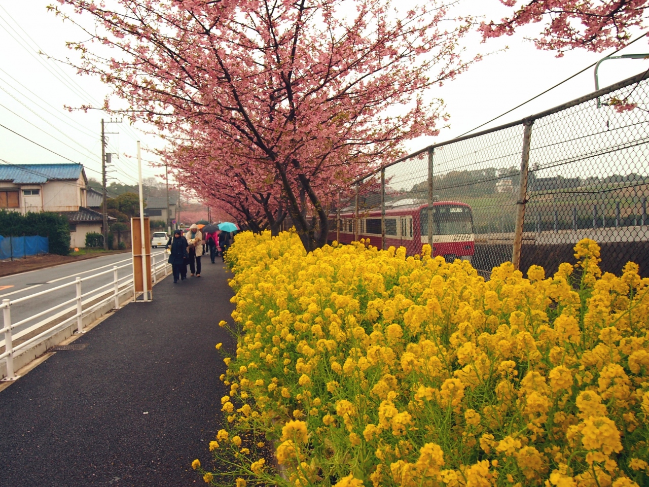 京急三浦海岸駅から小松ヶ池公園までの約1kmの線路沿いには約1000本の河津桜が植えられ足元に咲く菜の花ととコラボが最高のさんぽ道です。桜の開花時期には三浦海岸桜まつりも開催され地元の物産品が販売されます。桜はまだまだ見頃ですが延長されたさくら祭りは18日で終了しました。