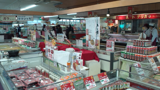 今晩のおかずに、美味しそうな焼肉用、しゃぶしゃぶ用の肉やコロッケなどの揚げ物類、ソーセージやハムなどの加工品がたくさん並びます。 それぞれのコーナーで試食もおこなわれていて、美味しいお肉をいくつか頂きました。 お肉を買っていた私の友人曰く、近所のスーパーなどと比べて、値段的には特に安くないけれど、お肉の質はかなり高いとのことでした。