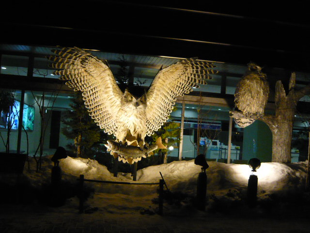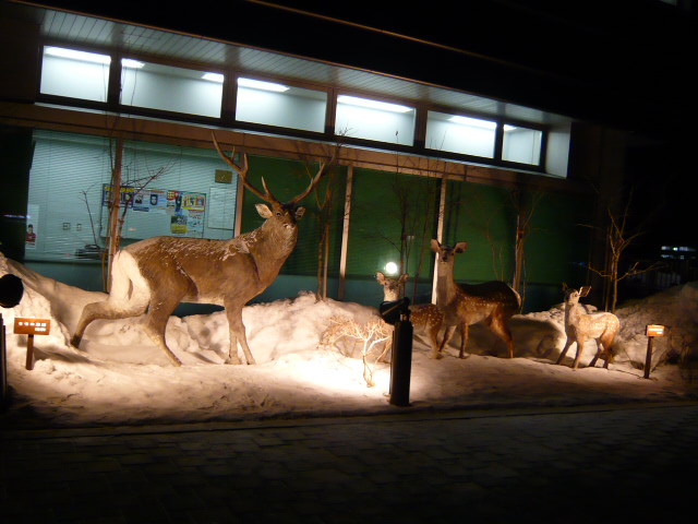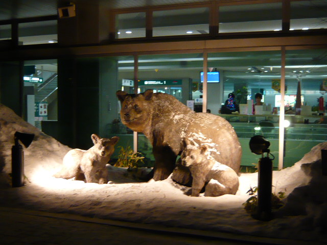 空港内はさほど特徴はありませんが、ビルの外側にタンチョウやエゾシカ、ヒグマなど像が置かれ、ライトアップされていたのが素敵でした。