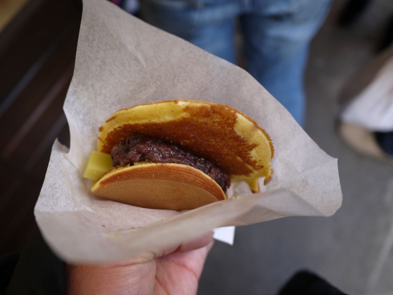 JRの駅構内などあちこちで見かけるお菓子屋さんですが、本店はこちら浅草の仲見世通りにあります。ごった返す仲見世通りで、長い行列に並んで買ったのはどら焼き。待っている間に職人さんが店先の鉄板で焼いています。中には、餡子と芋羊羹。甘いもの好きには堪らない組合せなのですが、それがまためちゃめちゃうまい。反則ではないかと思うくらい。卵でしょうか、バターでしょうか、生地自体の香りが素晴らしいし、餡子と芋羊羹のうまさとのベストマッチは脱帽です。