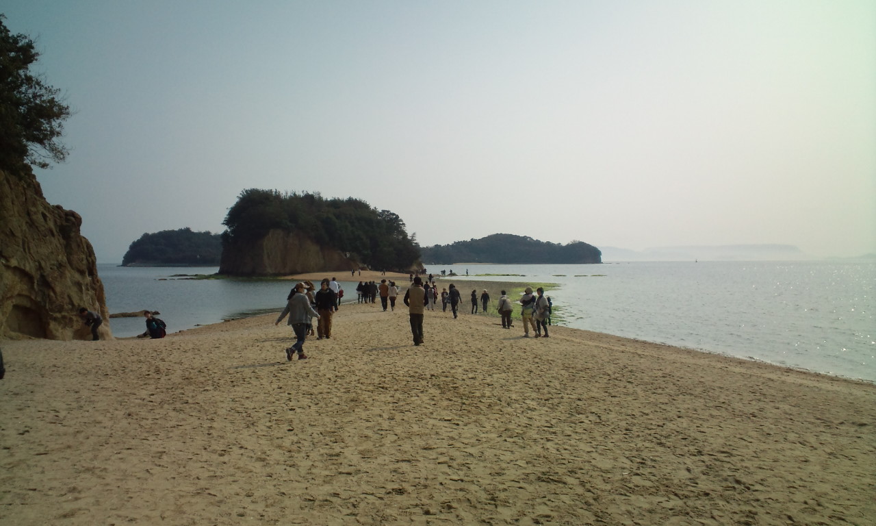 無料の駐車場と小さな売店があり、そこから徒歩1,2分でエンジェルロードです。干潮のピーク時に行ったので、エンジェルロードはけっこうな幅がありました。エンジェルロード入口あたりに階段があり丘の上に登れるのですが、そこから見下ろすようにするとエンジェルロードがよく見えます。