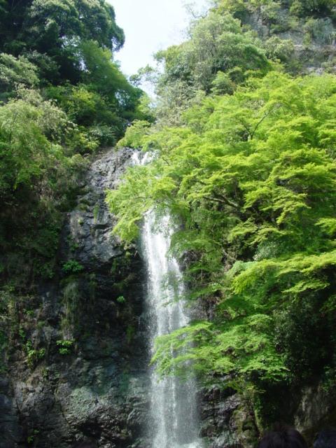 阪急宝塚線で石橋駅を目指し、石橋駅で箕面線に乗り換え、終点の箕面駅で下車すると、駅前から箕面の滝への散策が始まります。もみじの天ぷらなどのお店を過ぎると川沿いの遊歩道がはじまり滝を目指して歩きます。もちろん天ぷらで売られているもみじも遊歩道沿いにあります。目的の滝は遊歩道の終点で滝の周りにももみじがあります。ちょうど新緑の季節でとてもきれいでした。