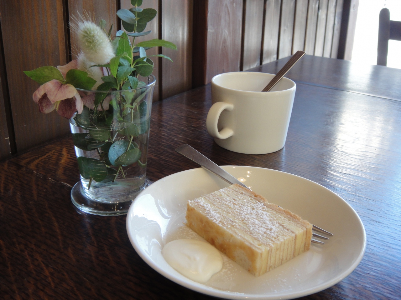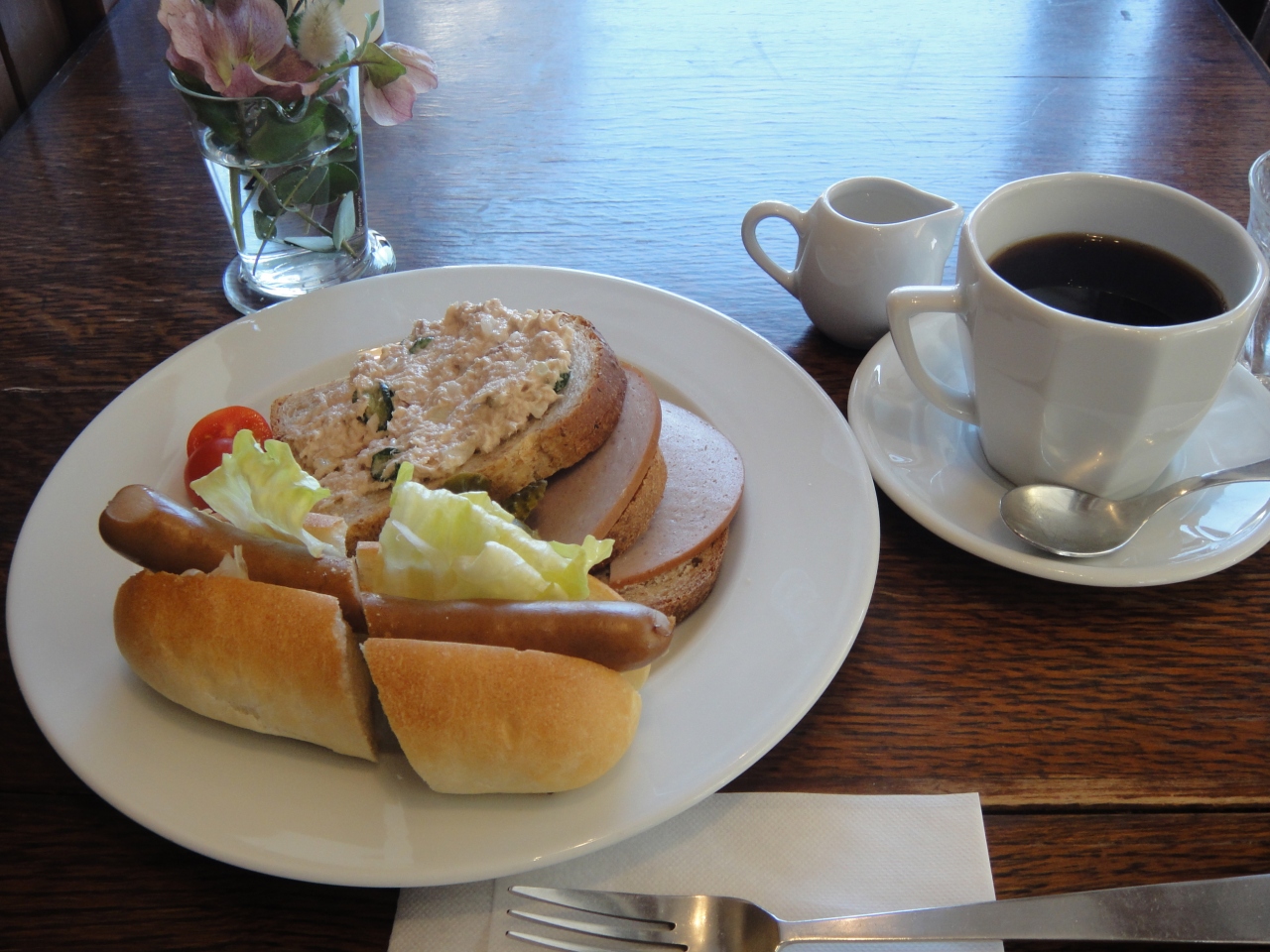 今回はランチの“ベルグサンドのセット”を注文。ソーセージとレタス、ハム、ツナのトッピングの3種類のサンドイッチとコーヒーor紅茶、そして小さなケーキ(この日はバウムクーヘンでした)がついて、¥1155とお手ごろです。パンは歯ごたえのあるしっかりしたパンです。トッピングの具材もおいしかったです。