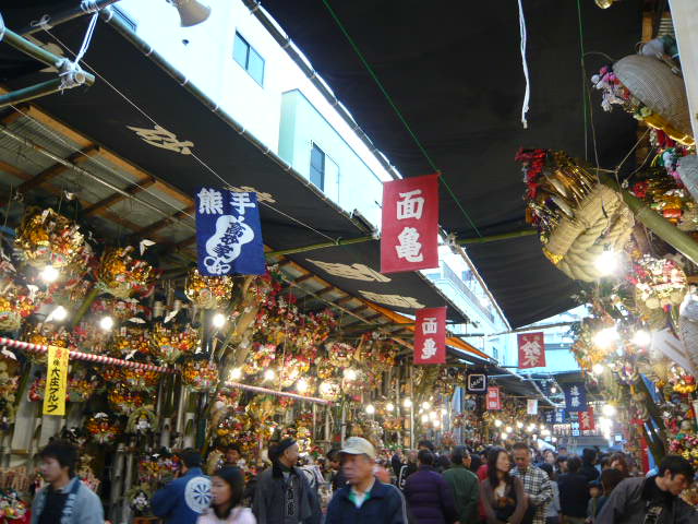 周辺の通りは通行止めになり、露店が立ち並びます。神社に入っていくと、熊手を売るお店がずらっと並び、熊手の多彩さに目を見張ります。趣向を凝らした熊手を見て廻るのだけでも楽しかったです。