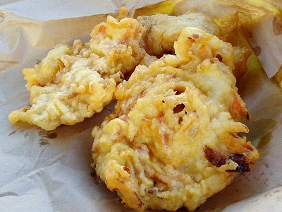 宮古島・平良の安くて美味しいてんぷら屋さん。店の奥ではおばちゃんたちがせっせと揚げ物と格闘し、店の外からもいい匂いが漂ってくる。四個で100円と激安のてんぷらは、魚・イカ・野菜x2でワンセット。本土で言うてんぷらと少し違って、ここのは衣の厚いフリッターだ。揚げたてのアツアツはとても旨い。島のおやつナンバーワン!!