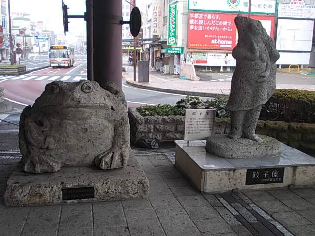 宇都宮、といえば餃子の町ですが、この駅には餃子像と並んでカエルさんの石像が鎮座していらっしゃいますので、餃子マニアのみならず、私のようなカエルマニアにもお勧めしたい駅です。尚、餃子&カエル像は、宇都宮駅の中央口を出て、歩道橋の下にあります。ちょっと解り辛いかもしれませんが、地元の方は餃子像のことをよくご存知なので、場所を尋ねてみて下さい。(決してカエル像としては尋ねないように…(笑)。)