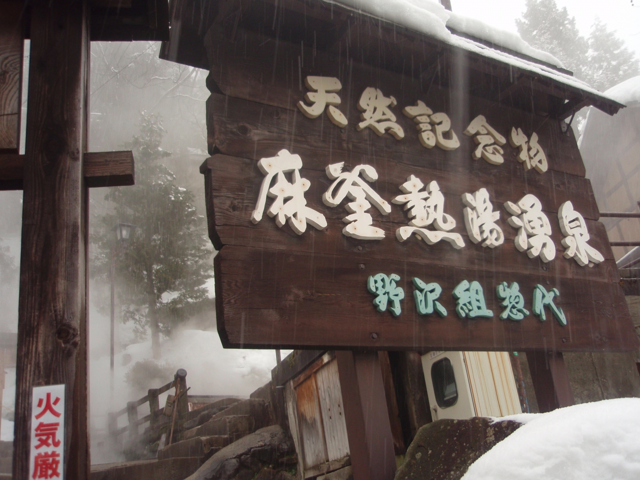 野沢温泉街の中ほどにあります。周辺はおみやげ屋さんや宿が軒をつらね賑やかです。スキー場へはこの脇を通っていきました。大きな看板が立っていなければなんだかわからなったかも。こういうのを見ると、温泉街に来たって感じがします。