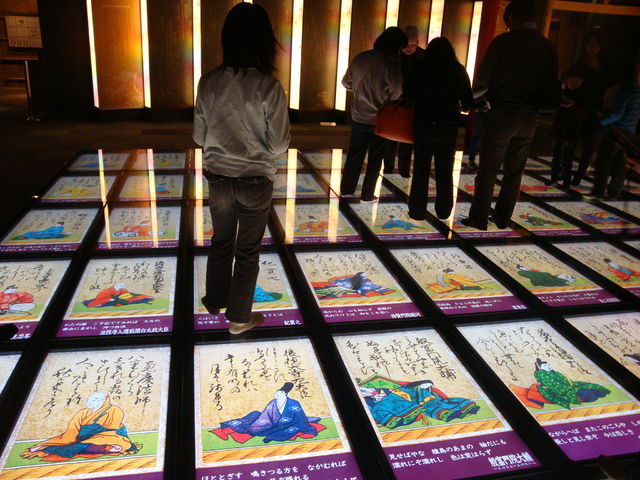 百人一首好きにはたまらない場所です!!古い百人一首の展示や、足で踏んで札をとるゲームが楽しめたり、DSソフトのゲームを大画面でプレイして最後まで倒せると認定の症状がもらえたりと盛りだくさん。少々入場料は高いですが、百人一首が好きな人は行って損のない場所です。