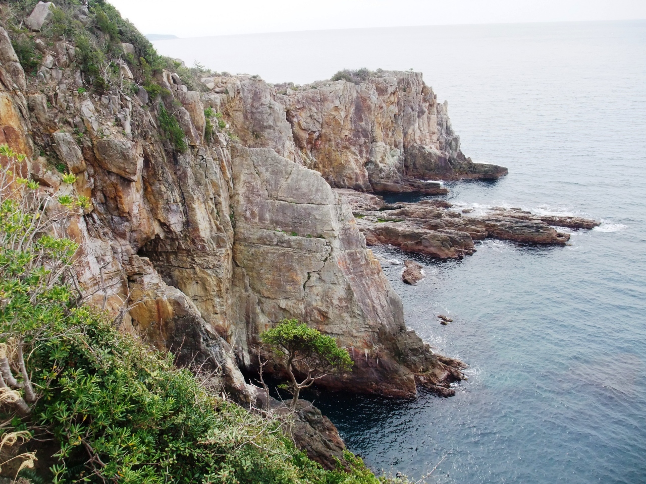 枯木灘海岸は、海岸段丘が断続的に発達し、サメの歯のような鋭い鋸歯状の出入りの多い海岸線が続く、リアス式海岸地形で、海食崖や洞窟、岩門、奇岩、岩礁と変化にとんでいるのが特徴です。
