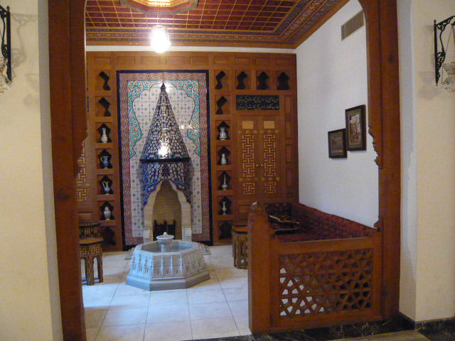 白亜の大理石にベージュと金の装飾がされた建物の中に入ると、集会場があり、奥にはサロンのようなお部屋。暖炉があり、中央に池のようなものがある変わったお部屋でした。
