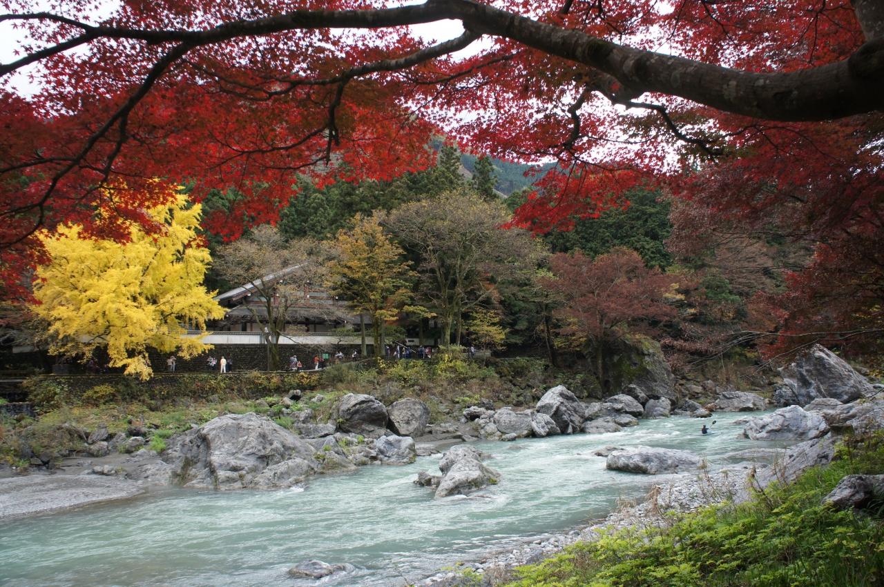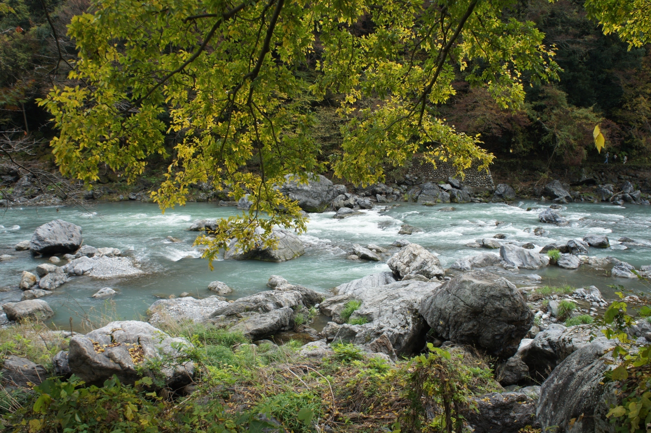 御岳渓谷は、JR御嶽駅からJR沢井駅まで、多摩川沿いに整備された御岳渓谷遊歩道を歩きました。多摩川は、温泉の硫黄成分でも溶けているのではないかと思うくらい、青く濁った流れ。途中には、ごつごつと大きな岩の集まる場所もあったり、想像した以上にダイナミックです。30分以上かけてゆっくり歩きましたが、途中、楓橋、御岳橋などつり橋に、周囲の紅葉林も組み合わさって、すばらしい景色の場所が何ヶ所もあります。川原でバーベキューを楽しむ人も大勢。ほか、川くだりをするカヌーもいたり、アクティブなアウトドア派にも人気のようです。