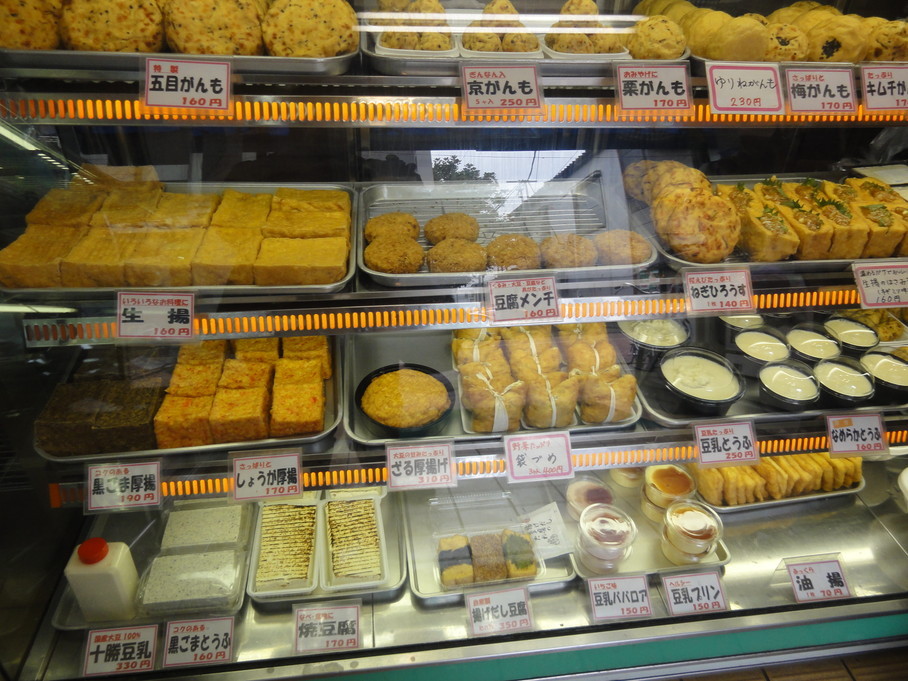大豆製品色々、がんもにもこんなに種類あるの?豆乳のプリン、豆腐メンチetc創業90年のお店は、専門店らしく、商品開発にも力を入れてます。本町センター商店街にあり、「北千住宿場とうふ」と幟が立ってます。この場所で作り、製造直売、ちい散歩の北千住編にも載ってました。