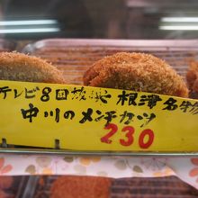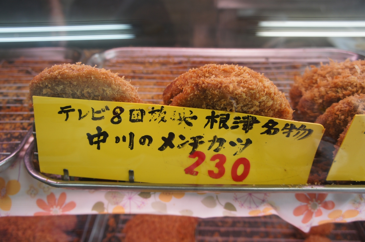 根津交差点すぐそば。小さなお肉屋さんなのですが、ここのメンチカツ230円が、でかくておいしいと評判のお店です。マスコミにも何度か取り上げられたようで、それをけっこうアピールしている様子。ただ、行列が出来るほどではないようで。さっそく、買って食べてみます。とんかつソースのような中濃ソースか、ウスターソースかを掛けてくださいということ。ウスターの方をたっぷりかけていただきました。量はありますが味の方は、でも普通かなあ。和牛の肉が少しは入っているんだと思いますが、よくわかりません。期待の方が高すぎたかもしれません。