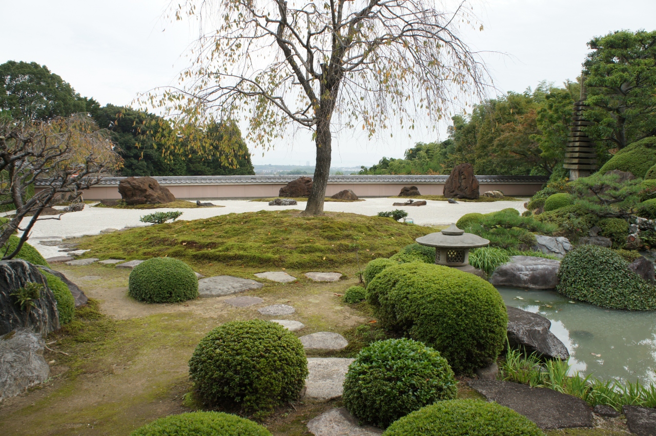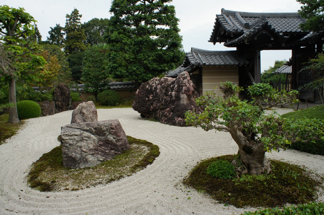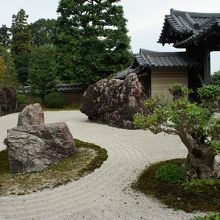 正法寺は、「しょうぼうじ」と読みます。大原野神社の向かい。住職が戦争から命からがら引き上げてきて、四国を巡礼したことが縁で、いろんな石の寄贈を受けたのだそうです。その石を使って作ったのが、鳥獣の石庭。客殿から眺めると、象、かえる、ライオン、ウサギ、亀ほか、動物に見立てた石をが平庭いっぱいに配されています。その向こうは、東山の山並み。ということは、京都の市街を挟んで西から東に対峙していることになります。これ以上ない雄大な借景といえます。シンプルな中にも力強さがあって、これも気に入りました。