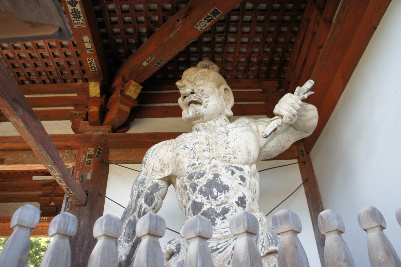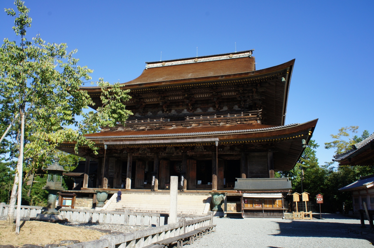 国宝蔵王堂は、金峯山寺(きんぷせんじ)の本堂。本尊である蔵王権現を祀ります。ちなみに、吉野・大峯は古代から山岳信仰の聖地。また、金峯山とは、吉野山と、その南方20数キロの大峯山系に位置する山上ヶ岳を含む山岳霊場を包括した総称です。しかし、やはりその中心はこの蔵王堂を有する金峯山寺。役小角(えんのおづぬ)によって開かれました。蔵王堂は、構造的には「一重裳階付き」。豊臣家の寄進で再興されたもので、1592年の建立。高さ34メートル、奥行、幅ともに36メートル。木造の古建築としては東大寺大仏殿に次ぐ規模と言われます。さて、内部の拝観は有料。逗子から半身を乗り出したような聖徳太子の像が印象に残りました。