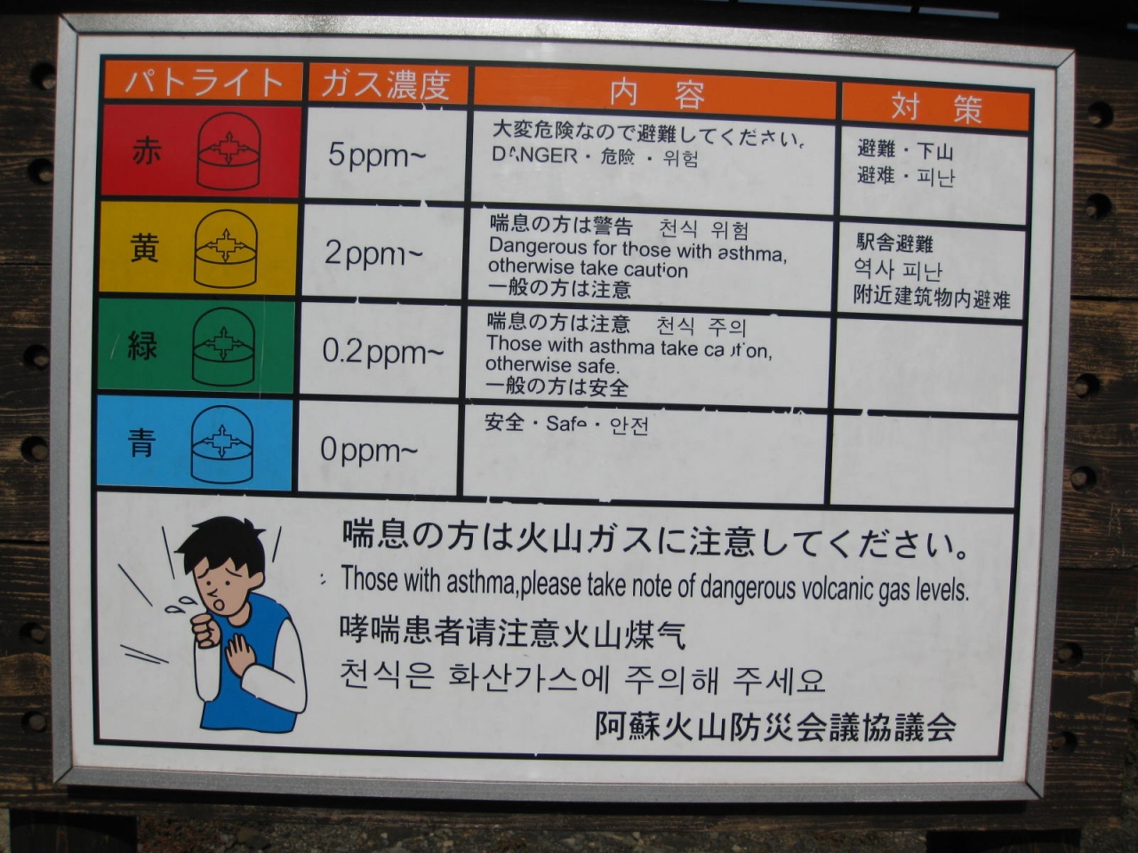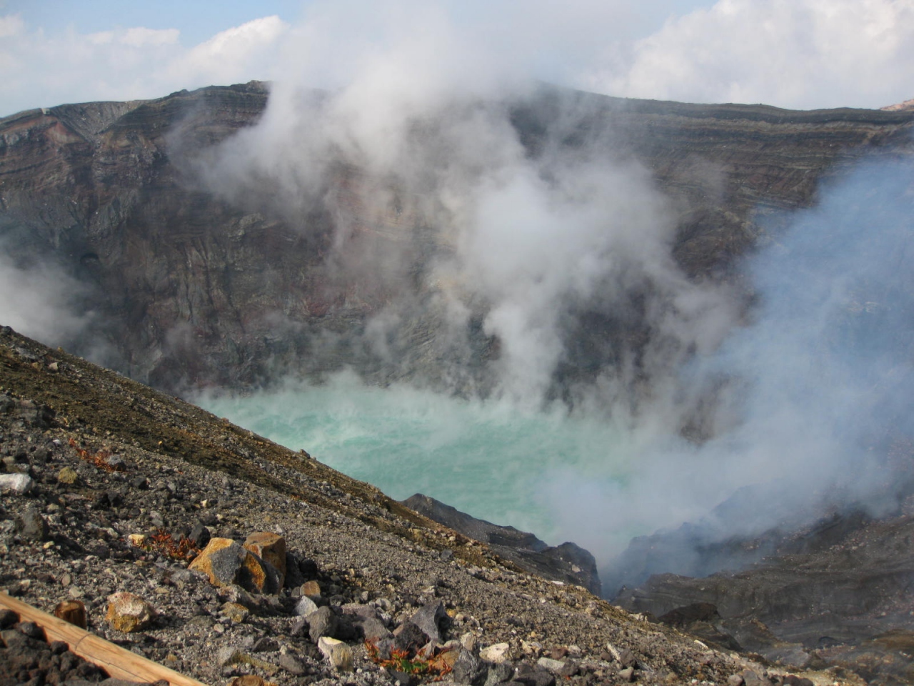 火口周辺には昔のトーチカのような退避壕が並んでいます。これは突然に噴火した場合などの際に避難する場所です。 写真にもありますすが、最近は有毒ガスが出ているらしく、監視する警備員の人がいて、風向により見学者の方向に噴煙が行くと退避命令が出されます。 まだ生きている火山ですね。 地球の息づかいを感じます。