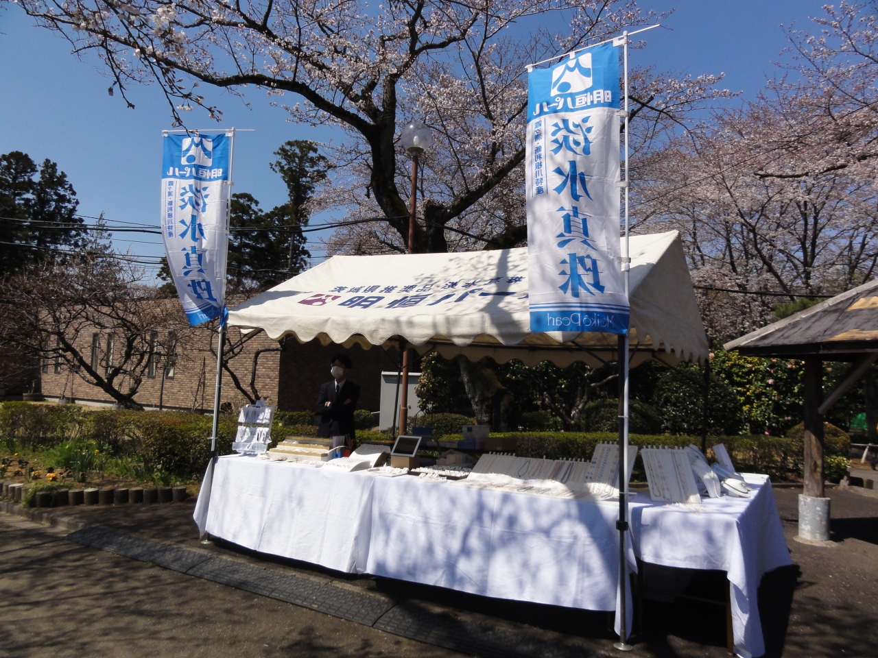 シャトーカミヤの桜祭りに行きました。バーベキューガーデン近くに明恒パールが出店してました。テントを張り、幟を立てて、ネックレス他展示してました。