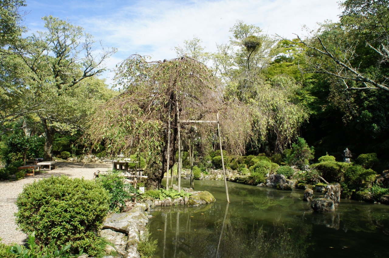 吉野の市街の一番奥の方。ここは、聖徳太子の創建で、その後、空海が入ったともされる名刹ですが、有名なのは群芳園という写真の庭。大和三庭園の一つとされ、千利休の作。細川幽斎の改修もされたとのことですが、多分、その名残は、池の周囲をめぐる石組みだと思います。石を立てて、池の際を固め、池の中には、小島を思わせるこれも立石。庭全体に、中国の桂林を似せて作るという中国から伝わった当初の思想が残っているように感じました。今では、中央に枝垂れ桜の大木もあって、花を添えていますが、鑑賞のポイントはそういうところだと思います。