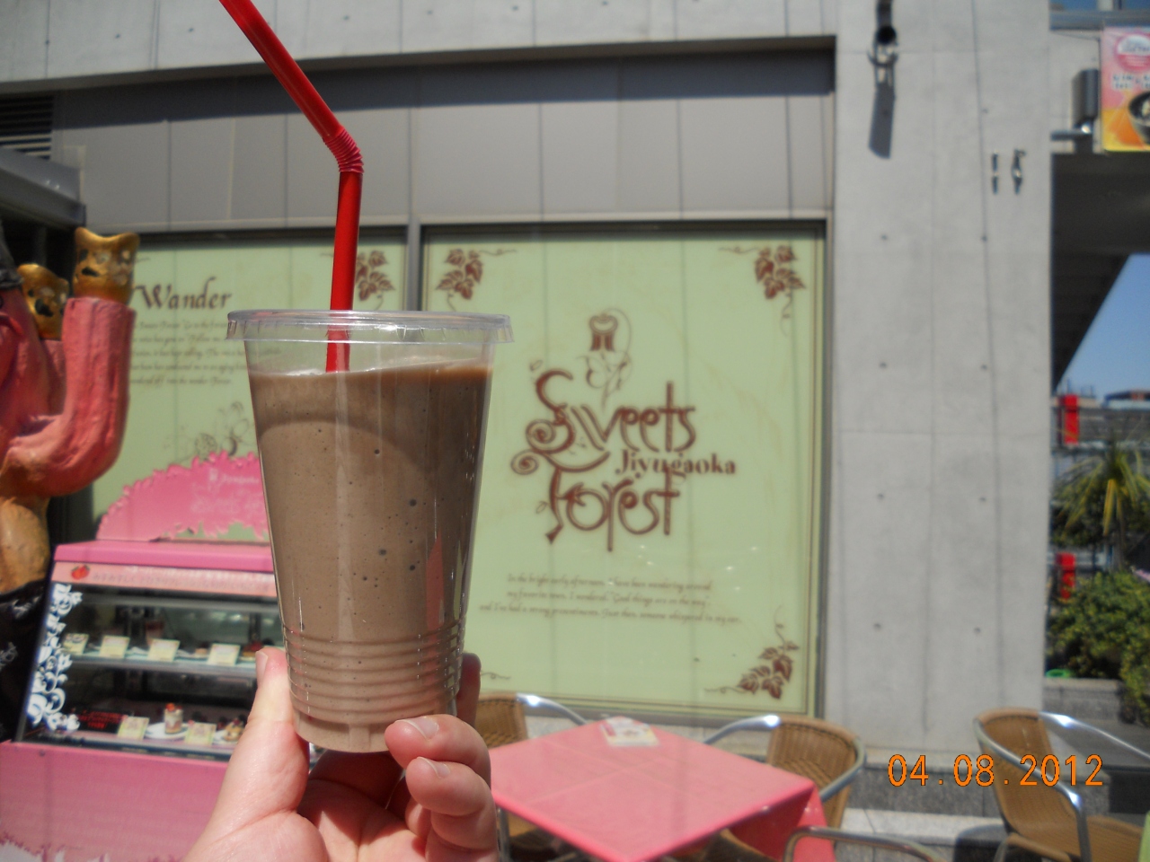 自由が丘に行ったときにスイーツフォレストに行きました。 オープンしたてのときは入場するにも行列を並んだ覚えがありますが、もうほとぼりが冷めたからか、日曜日に行ったのにガラガラでした。 何軒かケーキ屋さんが並ぶ中で、私はこのお店のチョコバナナスムージーをチョイス! バナナがゴロゴロ入ってて美味しかったけど、500円という値段はちょっと高いかな…。