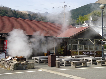 店頭では地獄蒸しの釜が湯気を上げています。