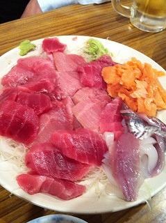 だって、山盛りのぶつ切りにしたようなマグロの刺し身が、
