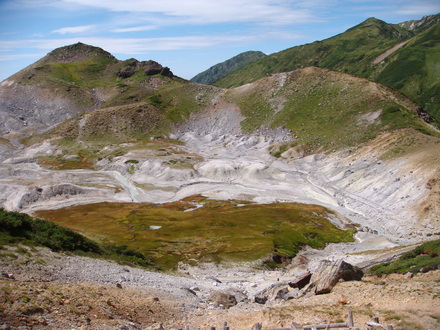 みくりが池やみどりが池は立山の火口湖で、地獄谷では現在でも火山性ガスが吹き出している様子を見ることができます。
