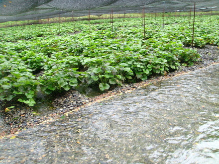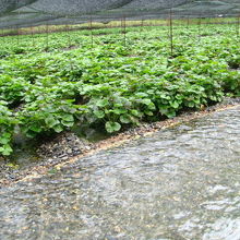 わさびの葉は直射日光に弱い為、4月から9月末まで黒い寒冷紗でわさび田を覆うそうです。