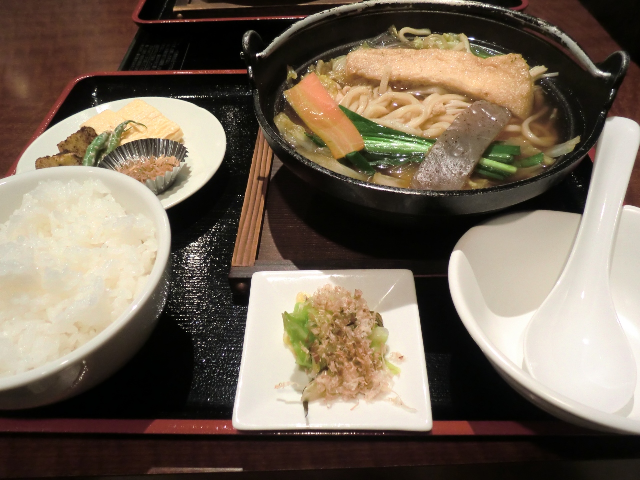 ちゃんこは、うどんとチキン、あげ、もやし、大根、ニンジン、こんにゃく、いわしのつみれ等が入っており