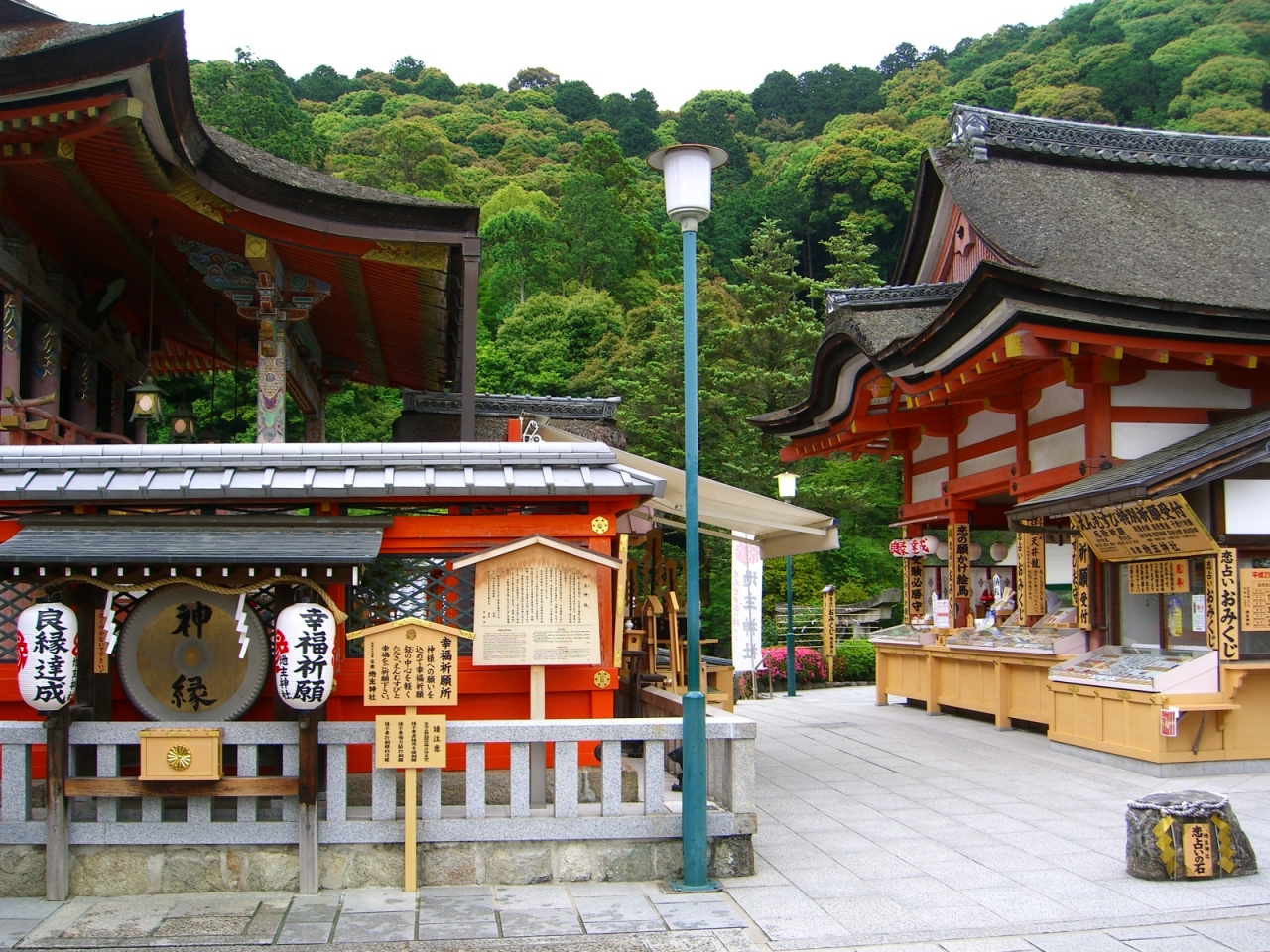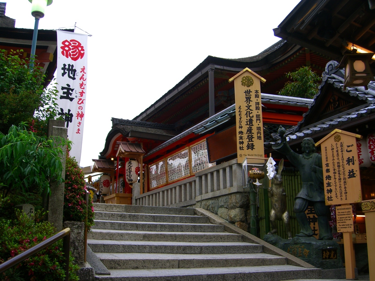 清水寺の一角にあり、赤い社殿が目を引きます。本殿、総門、拝殿等、重要文化財が多く、また縁結びの神社としても有名で多くの修学旅行生や若い女性がお守りとおみくじを買っていました。「恋占いの石」と言う石が二つあり、言い伝えでは片側の石からもう一方の石まで目をつぶってたどり着けば、恋が叶うと言われているようです。
